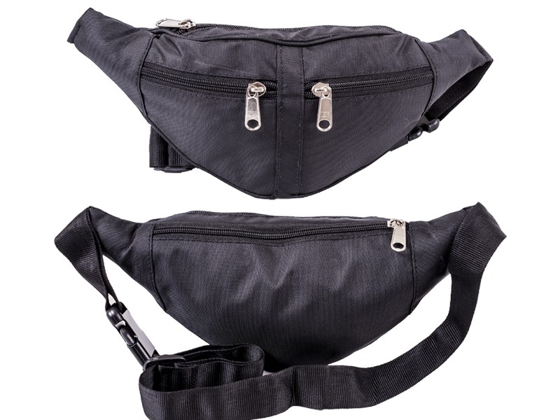 This bumbag by flightec is black in colour with multiple compartments. There is a main zip compartment at the top of the bag. A medium zip compatment at the back of the bag and two small zipped pockets on the front of the bag. It also features a black adjustable strap for around the waist.