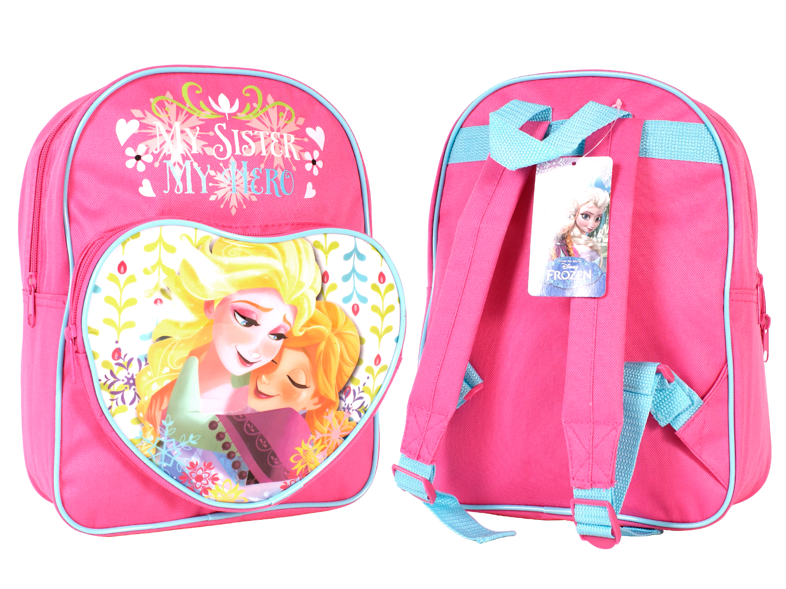 Frozen backpack with a heart shaped front pocket. Features one main zipped compartment, zipped front pocket, adjustable shoulder straps and a top grab handle.