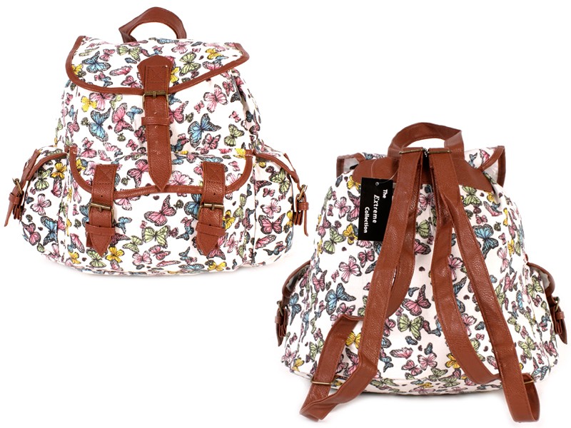 Butterfly patterned canvas backpack with drawstring and a top flap with magnetic popper fastening. Features one front and two side pockets with magnetic popper fastening, a top grab handle and adjustable shoulder straps. Also features a small zipped pocket and a mobile phone pouch inside. Dimensions: Height 30cm Width 35cm Depth 20cm Barcode: 5890234700242 Model: FW-151 BUTTERFLY WHITE Shipping Weight: 0.5lbs