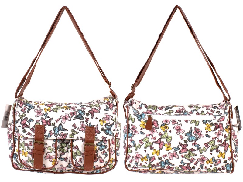 The Extreme Collection butterfly print canvas shoulder bag with buckle detail and magnetic snap fastening flap. Features one main zip compartment with a small zip pocket, two pouch pockets inside. Also features two front pouch pocket under the flap, slide in pouch pockets on each side, rear zip pocket and adjustable shoulder strap. Dimensions: Height 23cm Width 33cm Depth 14cm Barcode: 5890234700594 Model: FW-159 BUTTERFLY WHITE Shipping Weight: 0.4lbs