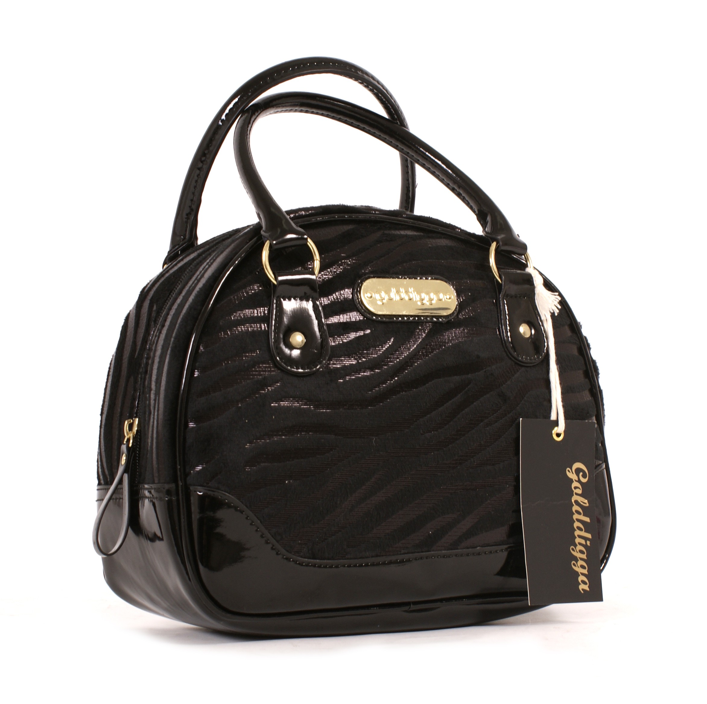 Golddigga PU fashion handbag with a zebra type battern design with two grab handles with one main zipped section.