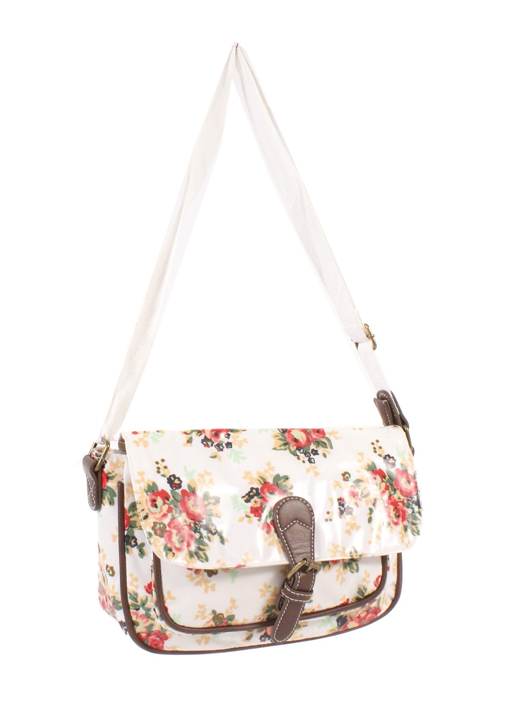Small floral pattern PU satchel bag with a front pouch, flap over closure with one main zipped entry and a canvas adjustable shoulder strap.