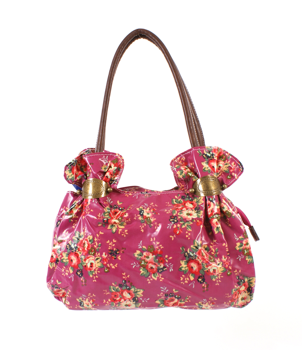 Floral pattern PU fashion bag with a main zipped pocket with two magnet press pouches either side and two grab handles. Measures – 37 x 10.5 x 32 cm