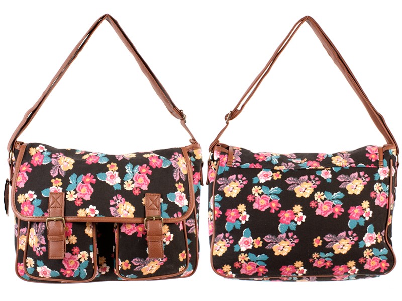 Patterned canvas shoulder bag with buckle detail and magnetic snap fastening flap. Features one main zip compartment with a small zip pocket and two pouch pockets inside. Also features two front pouch pocket under the flap and adjustable shoulder strap. Dimensions: Height 25cm Width 34cm Depth 16cm Barcode: 5053183019419 Model: HB-D-FP-01 SMALL FLOWERS Shipping Weight: 0.4lbs
