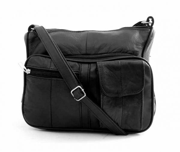 Leather handbag with an extandable shoulder strap. Has 3 front pockets, a back zip pocket and 2 main compartments. Measures 27x20x13cm approx.