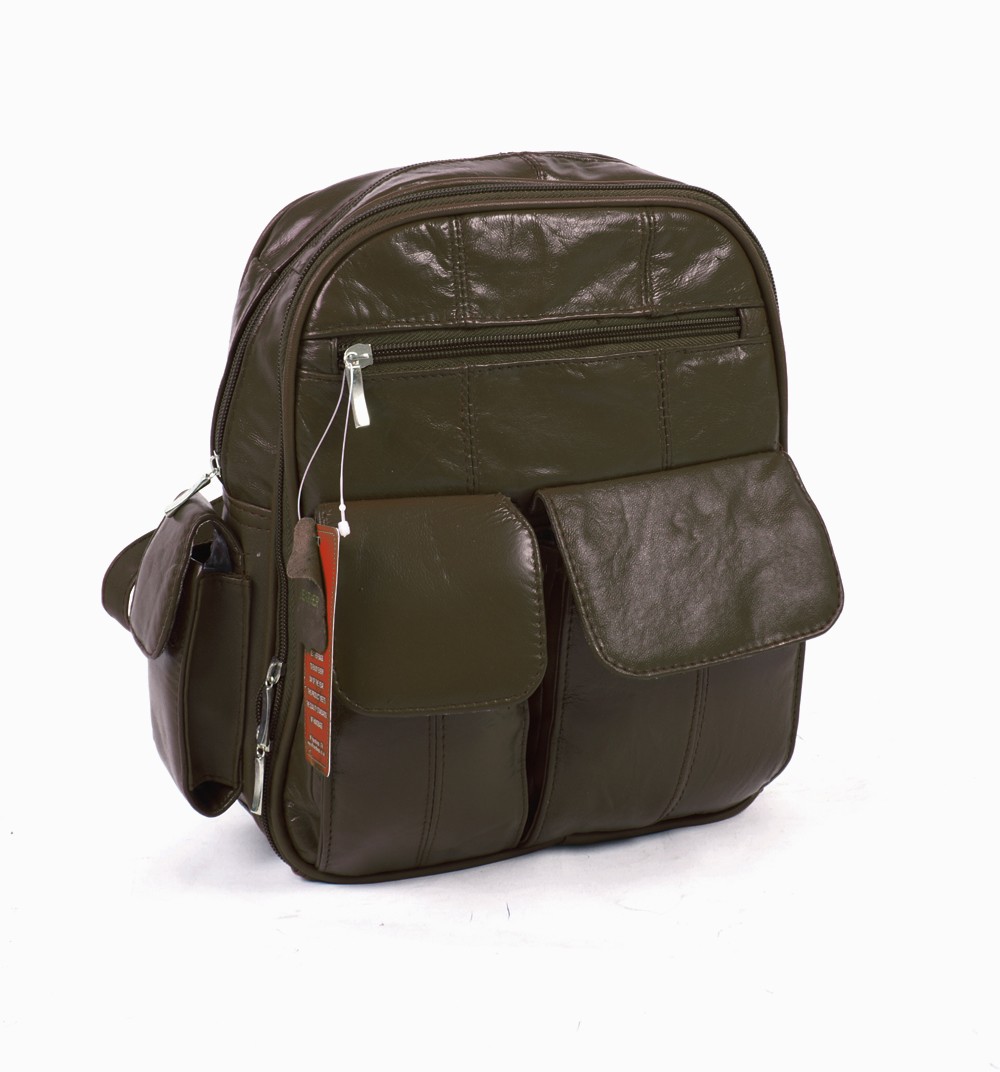Real leather medium sized handbag with multiple pockets on the front of the bag with a fully lined interior and an inside zipped pocket.