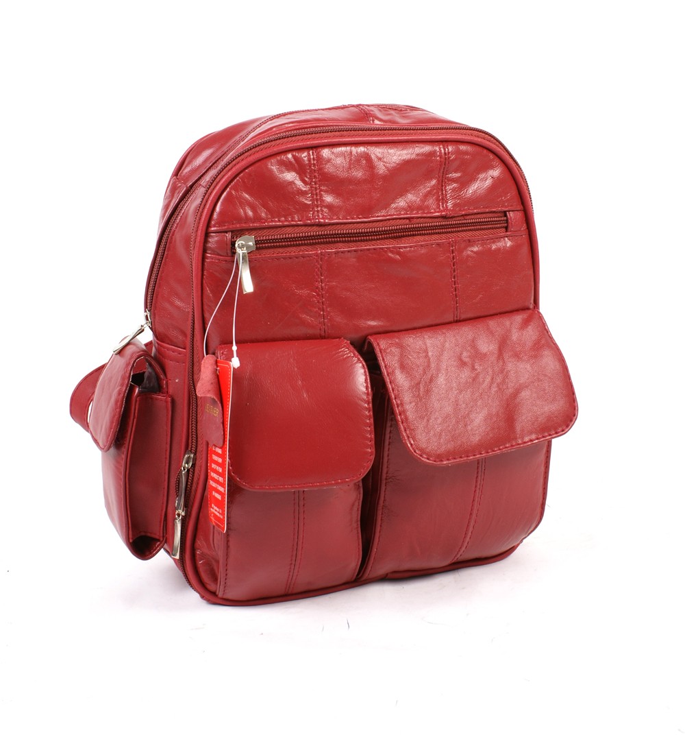 Real leather medium sized handbag with multiple pockets on the front of the bag with a fully lined interior and an inside zipped pocket.
