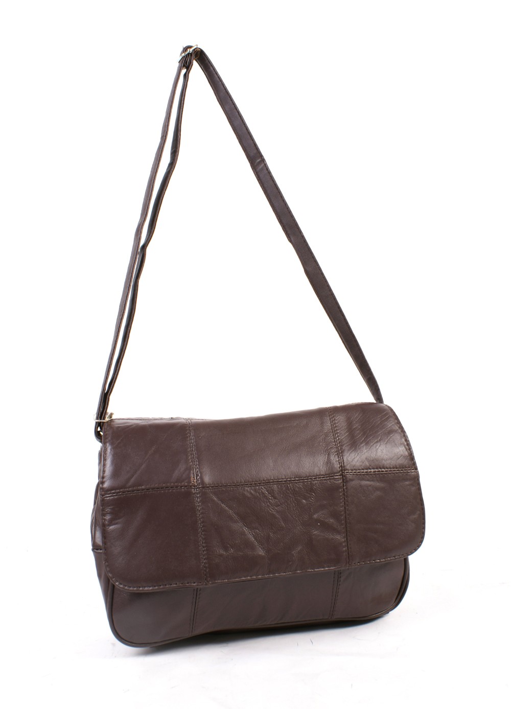 Real leather medium sized handbag with a magnetic clasp flap and a fully lined interior and an inside zipped pocket and adjustable shoulder strap.
