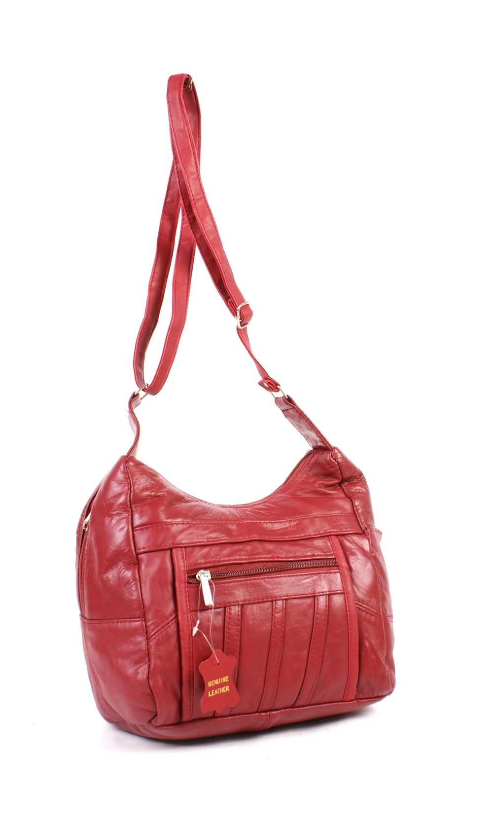 Real leather medium sized handbag a zipped pocket on the front of the bag with a fully lined interior and an inside zipped pocket and adjustable shoulder strap.