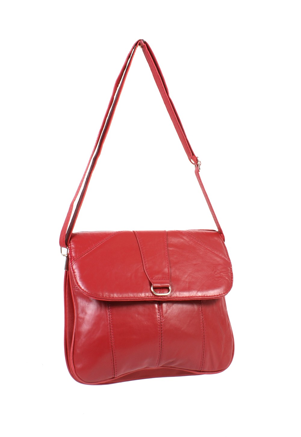 Real leather medium sized handbag with a magnetic clasp flap and a fully lined interior and an inside zipped pocket and adjustable shoulder strap.