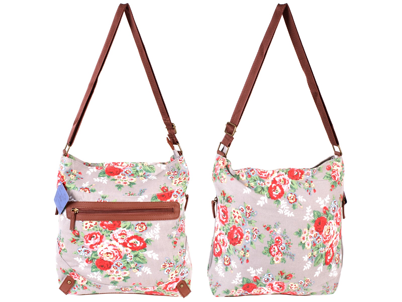 Rose patterned canvas shoulder bag with one main zipped compartment. Features a small zipped pocket, two pouch pockets inside, front zipped pocket, decorative side zips and an adjustable shoulder strap. Dimensions: Height 31cm Width 30cm Depth 18cm Barcode: 5053183017476