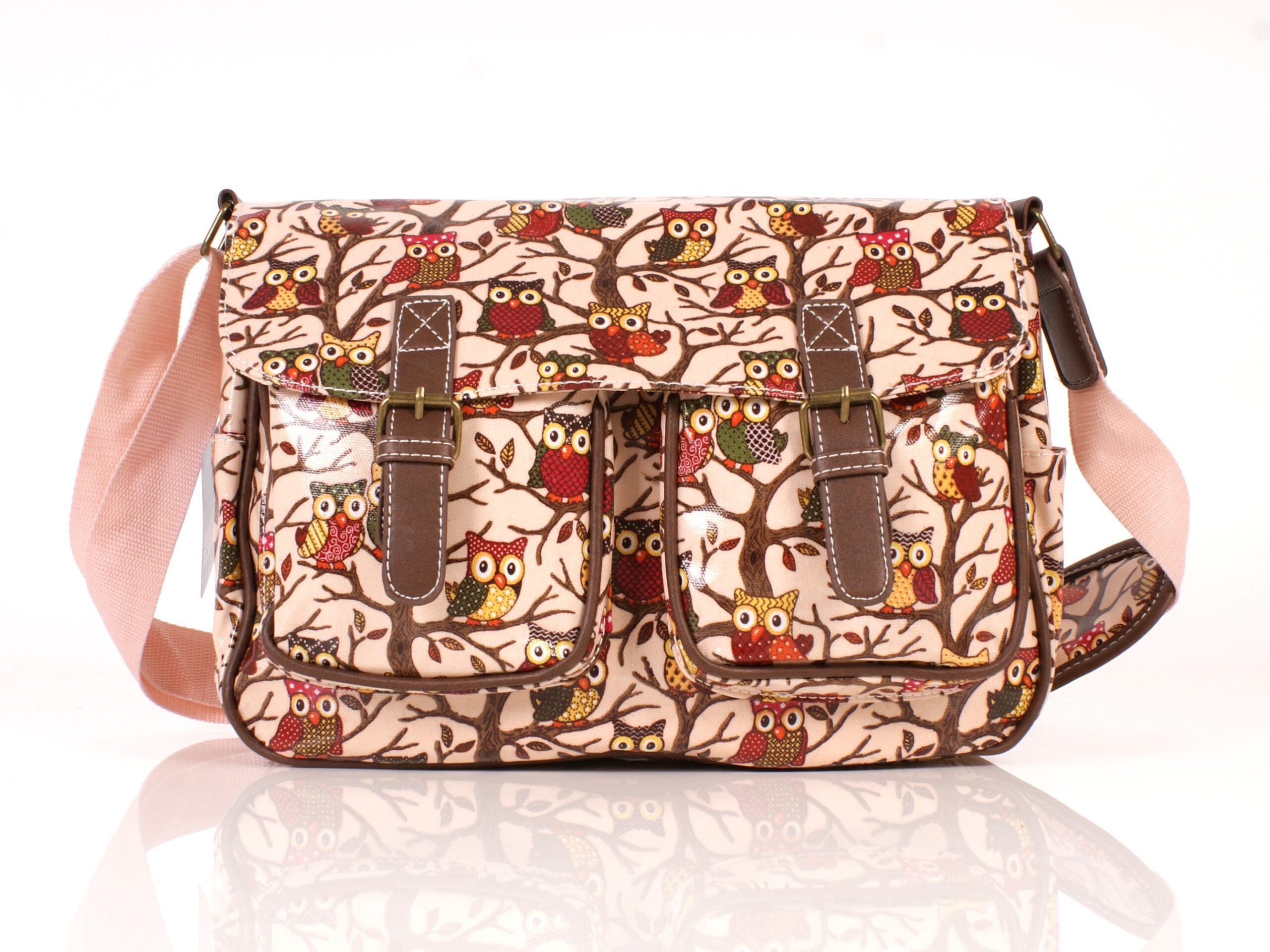 Owl patterned oil cloth large fashion handbag with one large front pocket, zipped pocket on the back, 2 side pouches, magnetic flaps and a main zipped entry with a canvas adjustable shoulder strap.