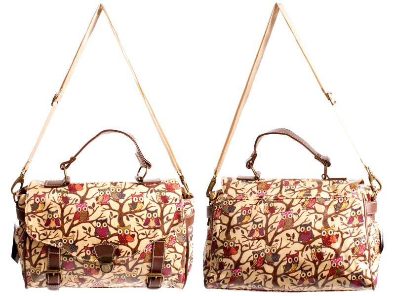 Satchel/messenger fashion bag with owl design and buckle detail, one main zipped compartment under a clip fastening flap. Features a small zipped pocket and two mobile phone pouches inside, has a detachable adjustable shoulder strap and a top grab handle. Dimensions: Height 20cm Width 33cm Depth 10cm Barcode: 5053183013133