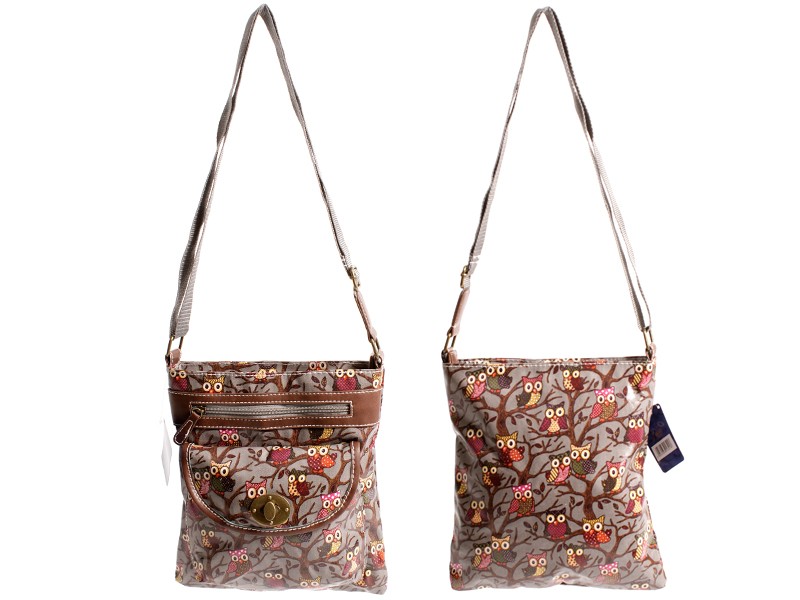 Owl patterned shoulder bag with one main zipped compartment with a small zipped pocket and two mobile phone pouches inside. Features a small zipped front pocket, a twist lock fastening front pocket and adjustable shoulder strap. Dimensions: Height 28cm Width 24cm Depth 2.5cm Barcode: 5053183013218