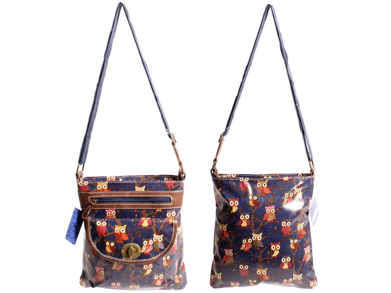 Owl patterned shoulder bag with one main zipped compartment with a small zipped pocket and two mobile phone pouches inside. Features a small zipped front pocket, a twist lock fastening front pocket and adjustable shoulder strap. Dimensions: Height 28cm Width 24cm Depth 2.5cm Barcode: 5053183013201