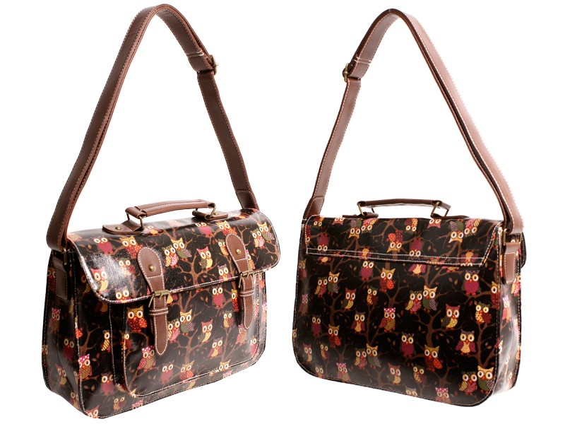 Satchel bag with owl design and buckle detail, one main zipped compartment under a concealed magnetic popper fastening flap and a front pocket under a flap. Features a small zipped pocket and two mobile phone pouches inside, has a adjustable shoulder strap – maximum length 110cm. Dimensions: Height 24cm Width 35.5cm Depth 10cm Front pocket dimensions: Height 17cm Width 24.5cm Depth 2cm Barcode: 5053183011527