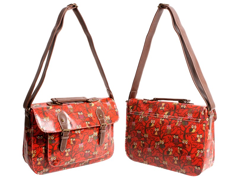 Satchel bag with owl design and buckle detail, one main zipped compartment under a concealed magnetic popper fastening flap and a front pocket under a flap. Features a small zipped pocket and two mobile phone pouches inside, has a adjustable shoulder strap – maximum length 110cm. Dimensions: Height 24cm Width 35.5cm Depth 10cm Front pocket dimensions: Height 17cm Width 24.5cm Depth 2cm Barcode: 5053183011597