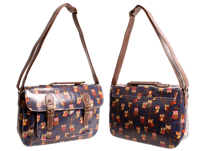 Satchel bag with owl design and buckle detail, one main zipped compartment under a concealed magnetic popper fastening flap and a front pocket under a flap. Features a small zipped pocket and two mobile phone pouches inside, has a adjustable shoulder strap – maximum length 110cm. Dimensions: Height 26cm Width 38.5cm Depth 10.5cm Front pocket dimensions: Height 18cm Width 28cm Depth 2cm Barcode: 5053183011634