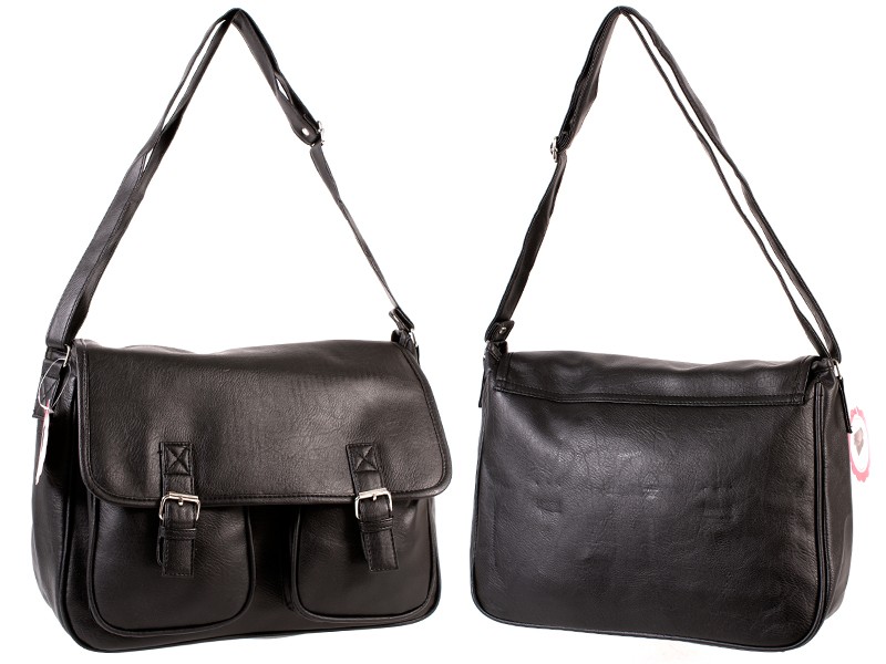 PU satchel/shoulder bag with one main zip compartment under a magnetic snap fastening flap. Features a small zip pocket and two pouch pockets inside. Also features a two front pouch pockets under a flap and an adjustable shoulder strap. Dimensions: Height 26cm Width 32cm Depth 15cm Barcode: 5053183018954 Model: HB-PU-01 BLACK Shipping Weight: 0.7lbs