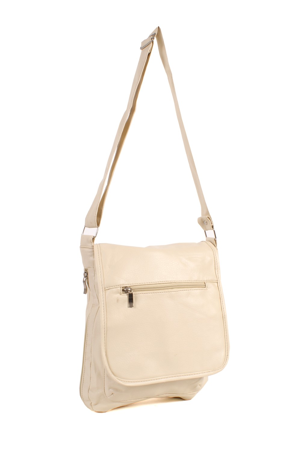Cross body adjustable strap handbag, front flap over with magnetic clasp, zipped pockets to front and back, zipped centre compartment with inner zipped pocket.
