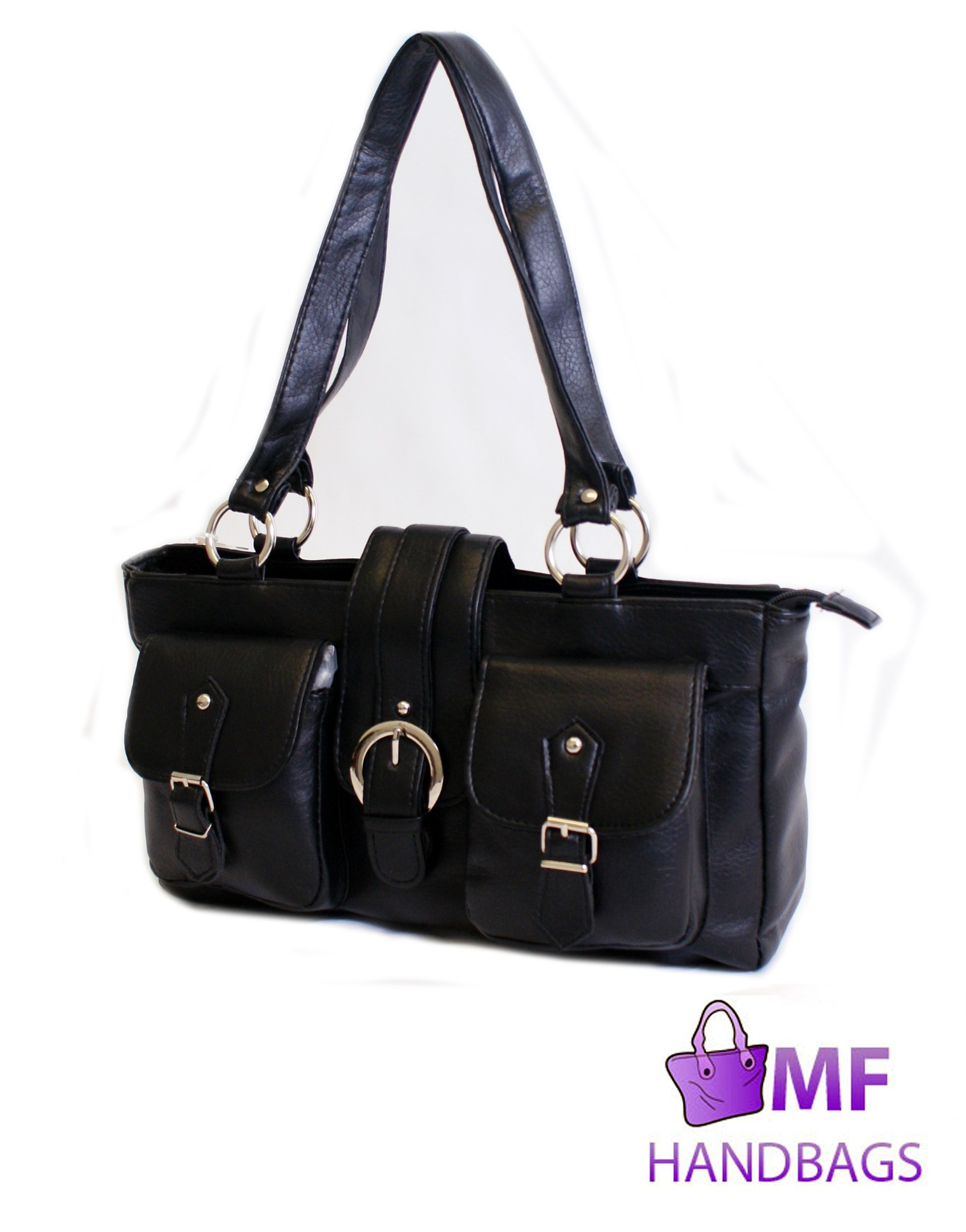 This PU Handbag possesses 2 front pouches and one large main compartment, with 1 large rear zipped pocket.
