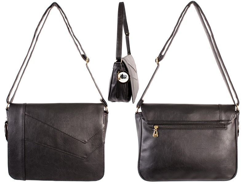 PU fashion handbag with one main zip compartment under a magnetic snap fastening flap with small zipped pocket and a mobile phone pouch pocket inside. Features two vertical zip pockets under a magnetic snap fastening flap, zip pocket on the side and a rear zip pocket. Also features an adjustable shoulder strap.