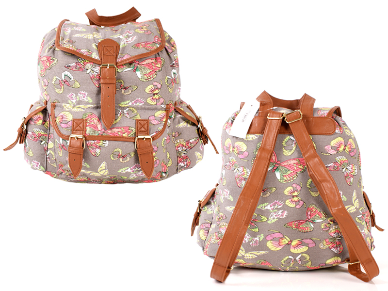 Glitter butterfly patterned canvas backpack with drawstring and a top flap with magnetic popper fastening. Features one front and two side pockets with magnetic popper fastening, a top grab handle and adjustable shoulder straps. Also features a small zipped pocket and a mobile phone pouch inside. (the glitter detail is on the wings)