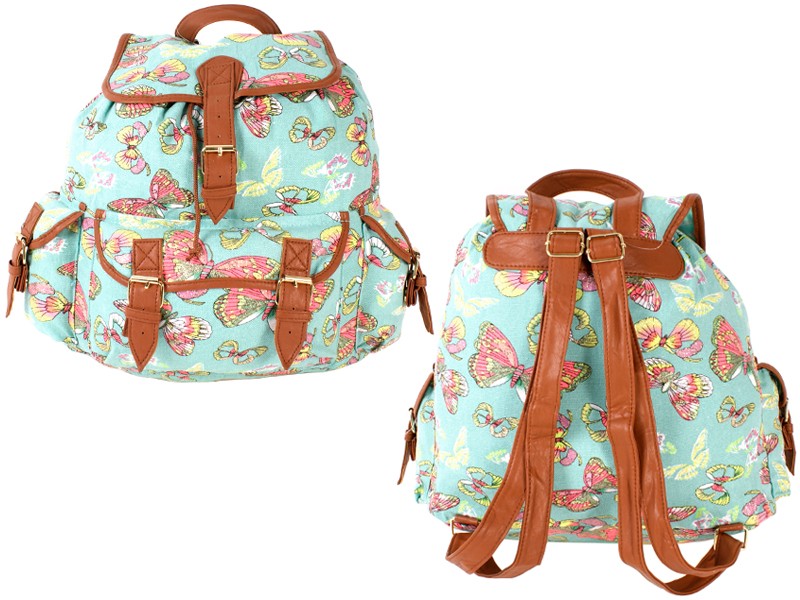 Glitter butterfly patterned canvas backpack with drawstring and a top flap with magnetic popper fastening. Features one front and two side pockets with magnetic popper fastening, a top grab handle and adjustable shoulder straps. Also features a small zipped pocket and a mobile phone pouch inside. (the glitter detail is on the wings)