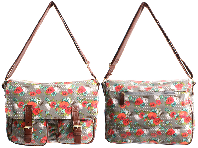 Amelie dragonfly patterned oiled cloth shoulder bag with buckle detail. Features one main zipped compartment under a concealed magnetic popper fastening flap. Also features small zipped pocket and two mobile phone pouches inside, has two front pouch pockets under the flap, rear zipped pocket, slide in pouch pockets on each side and an adjustable shoulder strap.