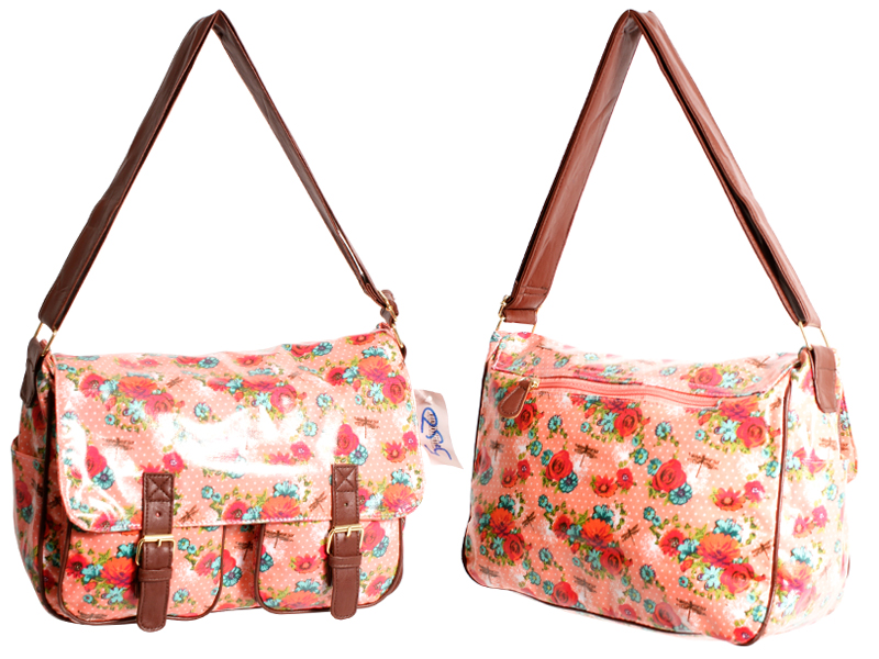 Amelie dragonfly patterned oiled cloth shoulder bag with buckle detail. Features one main zipped compartment under a concealed magnetic popper fastening flap. Also features small zipped pocket and two mobile phone pouches inside, has two front pouch pockets under the flap, rear zipped pocket, slide in pouch pockets on each side and an adjustable shoulder strap.