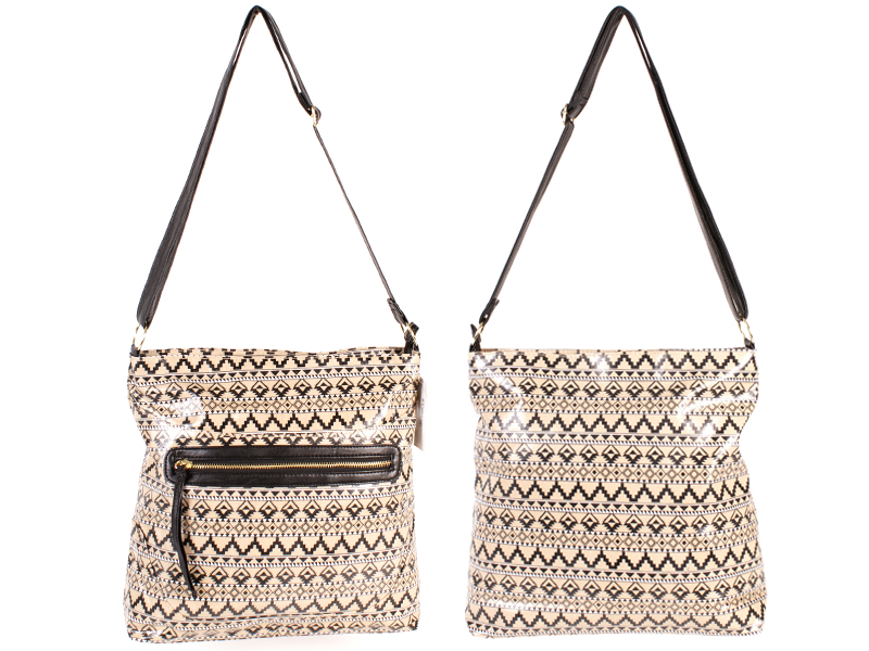 Amelie Aztec pattern oil cloth shoulder bag with main zip compartment, front zip pocket and adjustable shoulder strap. Features a small zip pocket inside and a mobile phone pouch.