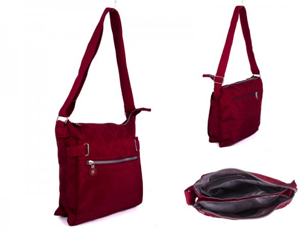 two front zipped compartments, one back zip compartment and adjustable strap.