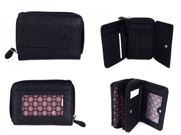 Ridgeback purse with stylish poppered front that leads to a number of card and id slots with large note slot. The middle is your zipped coin pocket and rear has poppered closed card and id slot pockets. The back has clear id slot. All lined in fabric.