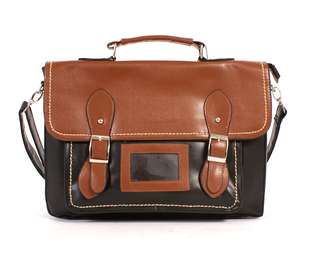 PU satchel handbag with front pouch, adjustable shoulder strap and magnetic clasp closure with fully lined interior.