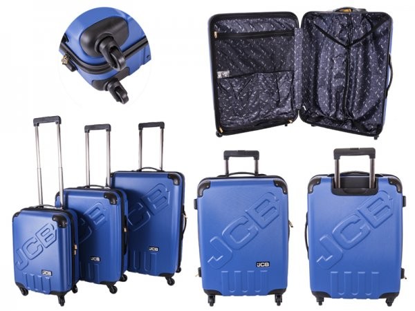 Model: JCB006 BLUE Shipping Weight: 20lbs JCB006 BLUE JCB Set of 3 super-durable 4 wheeled suitcases. Features: -The JCB luggage set is manufactured from high-quality durable,pure 80% ABS andPC. -Reinforced corners. -Top and one side handle. -Customized High-quality telescopic handle. -Fashionable colors for easy identification on the conveyor belt. -Quality zippers with ergonomic zipper pullers. -Smart and functional interior pockets. -PU coated lining with grey padding for easy identification of content. -Four strong and high-quality wheels system. -Rotates a full 360 degrees. -Significantly increases rolling capabilities. -Free TSA padlock included. Barcode: 5055492040466 26″ Dimensions: 66 x 47 x 28.5 cm Packing: 88.5 Ltr Weight: 4.2kg 22″ Dimensions: 56 x 42 x 25 cm Packing: 58.8 Ltr Weight: 3.4kg 20″ Dimensions: 46 x 36 x 21.5 cm Packing: 35.5Ltr Weight: 2.5kg Cabin size, approvet: Easyjet, Ryanair,BA, Virgin,Iata
