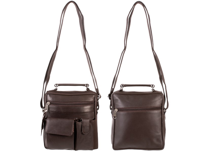 Small genuine leather cross body shoulder bag with one main zipped compartment with a small zipped pocket inside. Features one front zip pocket and 2 velcro fastening pockets, a rear zipped pocket, an adjustable shoulder strap and a top grab handle. Dimensions: Height 20cm Width 18cm Depth 9cm Barcode: 0000028026068 Model: PR-DD 01 BROWN Shipping Weight: 0.6lbs