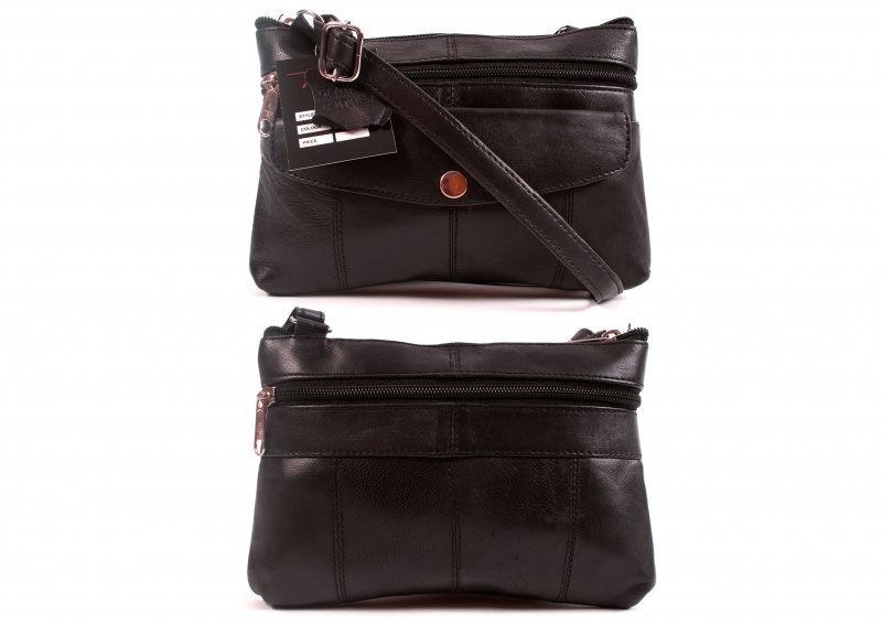 Small genuine leather handbag with a main zipped section, a rear zipped pocket, a front zipped pocket and a front popper fastening pouch. Features an adjustable shoulder strap.