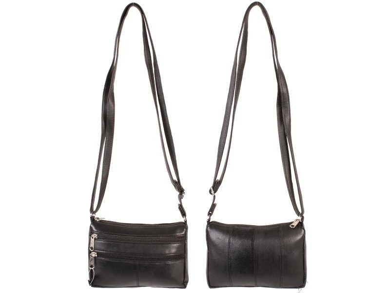 Small genuine leather handbag/shoulder bag with one main zipped compartment with a small zipped pocket inside. Features 2 front zipped pockets and an adjustable shoulder strap. Dimensions: Height 14cm Width 19cm Depth 4cm Barcode: 0000028026044 Model: PR-DD 09 BLACK Shipping Weight: 0.3lbs