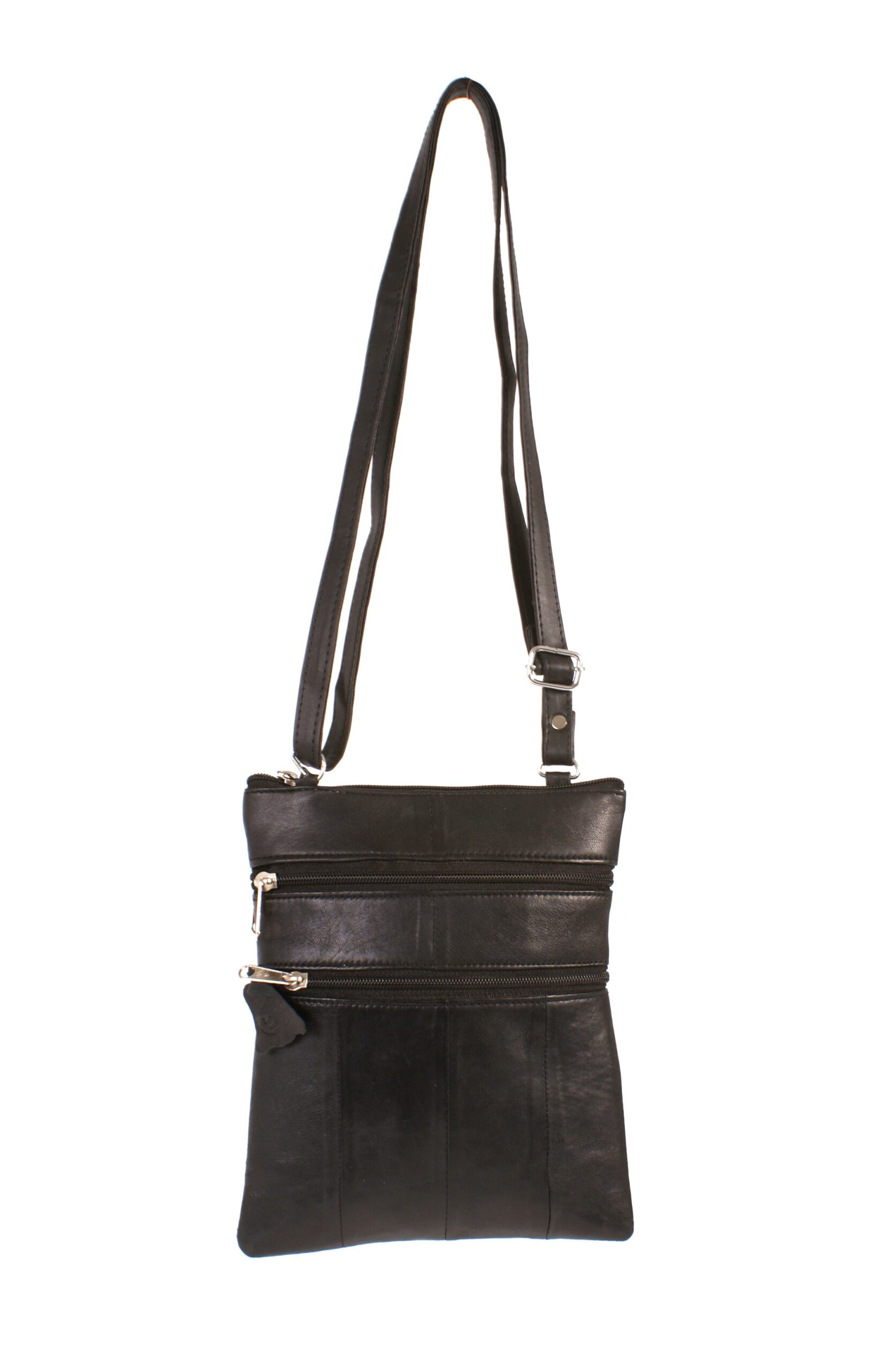 Small real leather nappa cross body shoulder bag with one main section and two front zipped pockets and an adjustable shoulder strap.