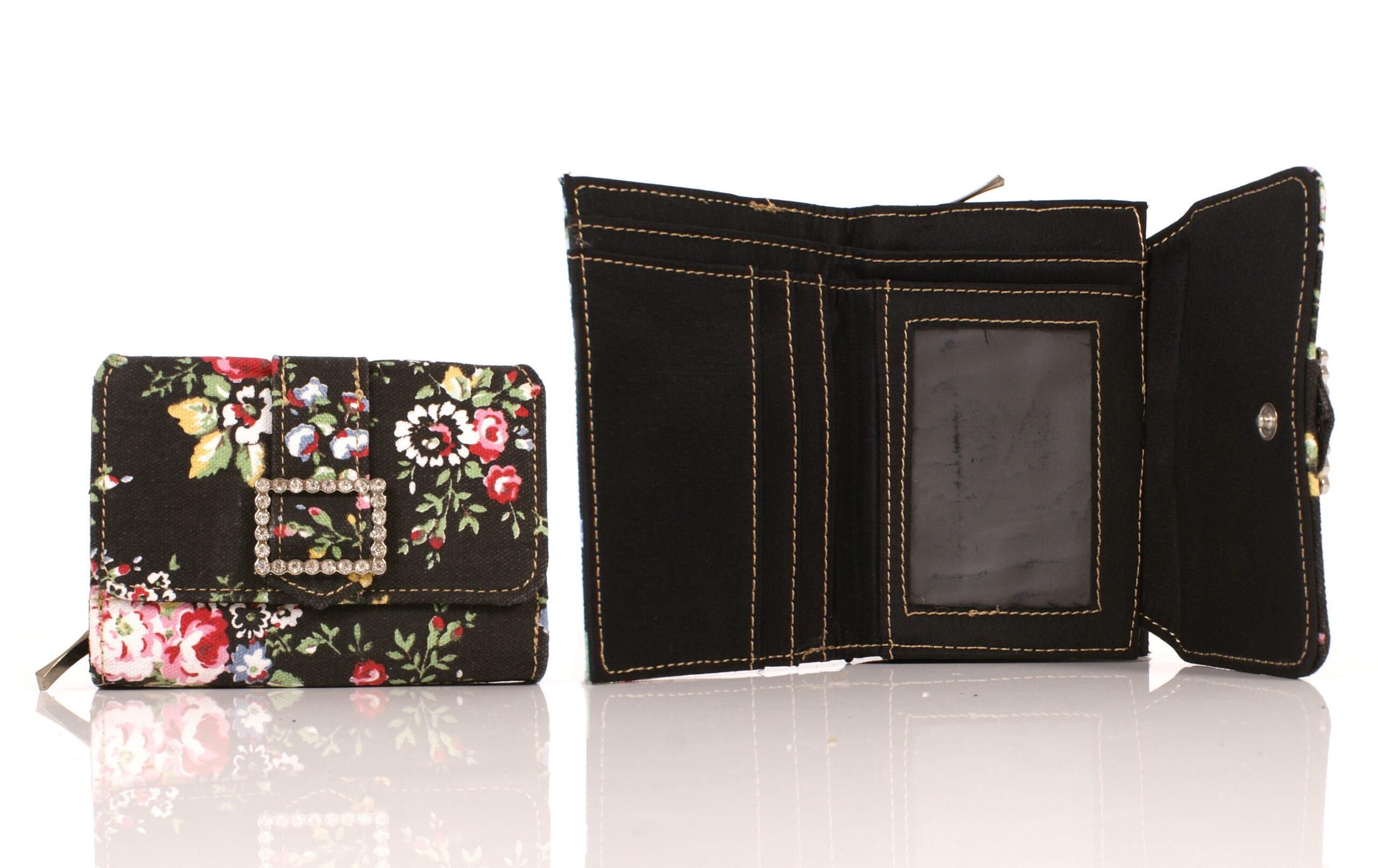 Canvas purse with microfibre interior. Many card slots, a cash compartment, an ID holder and a large concertina zipped purse on the back.
