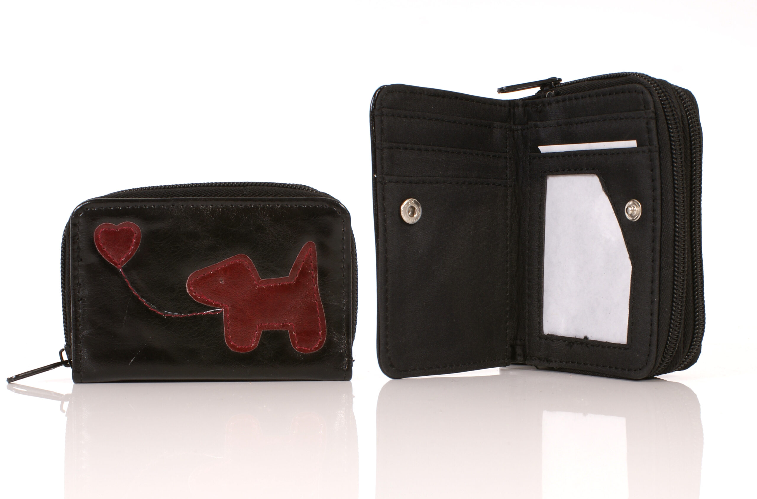 PU dog patterned purse with a microfibre interior ID slot and 2 zipped concertina purse on the back.