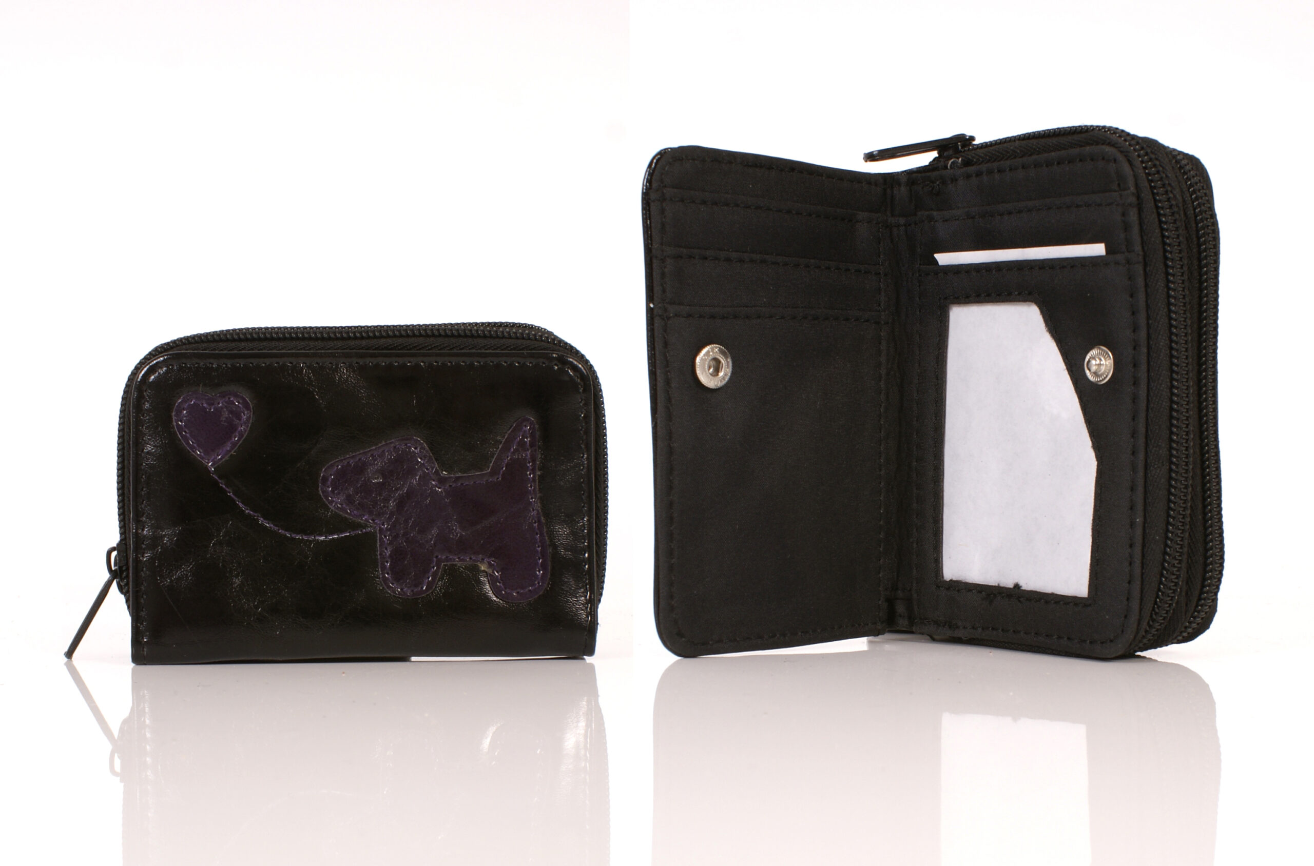 PU dog patterned purse with a microfibre interior ID slot and 2 zipped concertina purse on the back.