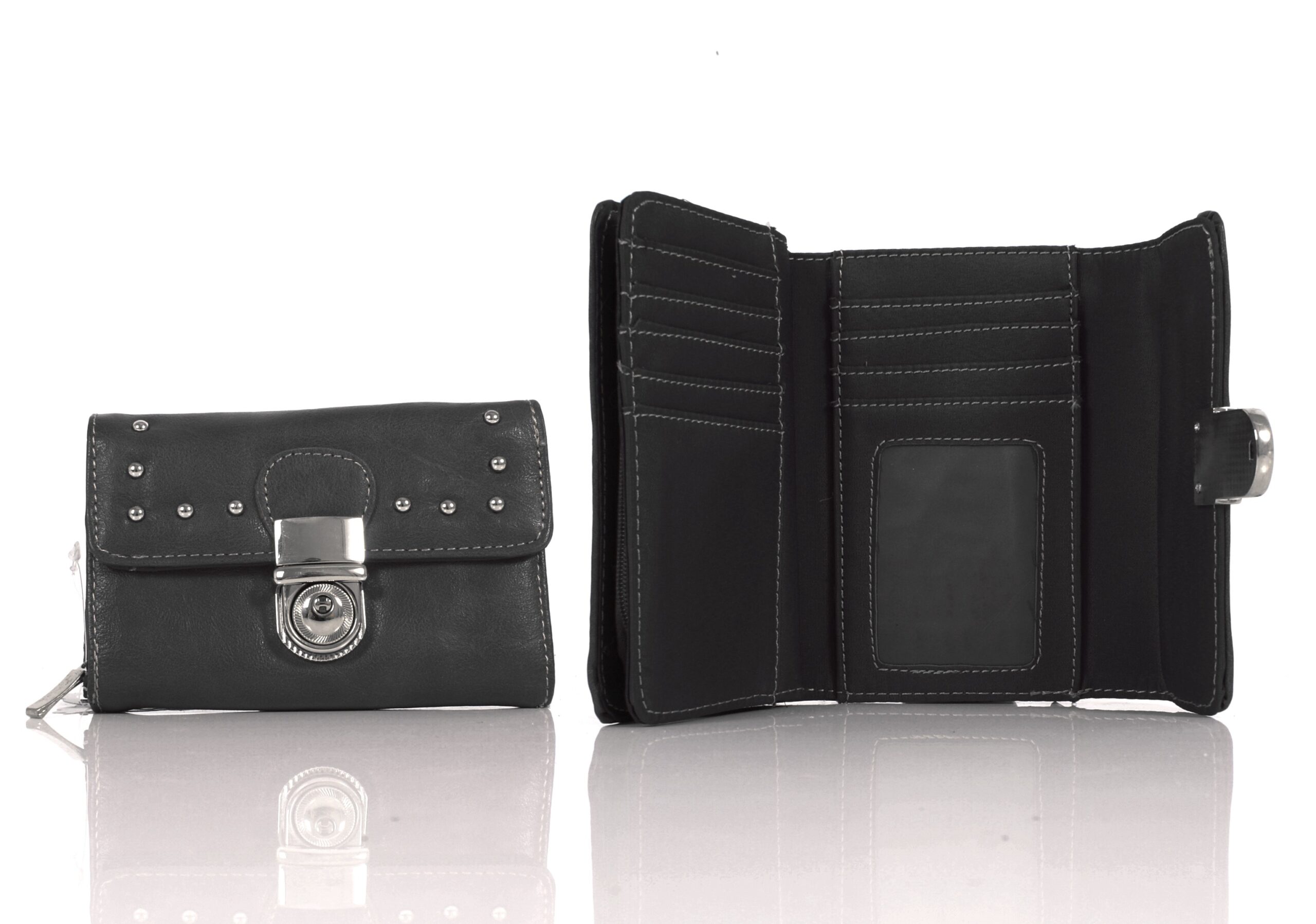 PU purse with PU interior. Many card slots, a cash compartment, an ID holder and a concertina zipped purse.
