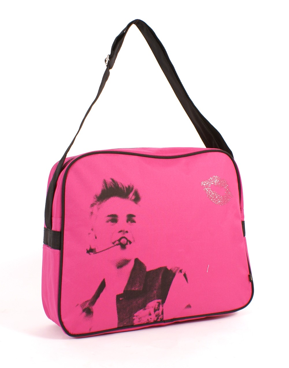 Rockstock messenger bag depicting Justin Bieber. Comes with adjustable shoulder strap measuring 35 cm in length.