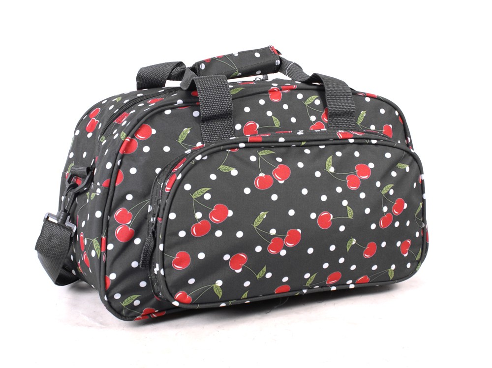 Small cherry pattern flight bag with front zipped pocket.  Measures approx 43 x 19.5 x 24 cm – Volume – 23 Litres.