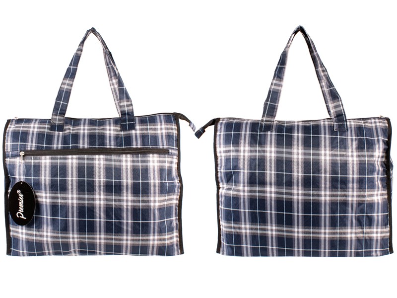 Premier tartan patterned shopping bag with one main zipped compartment and outer zipped pocket. Features a small zipped pocket inside.