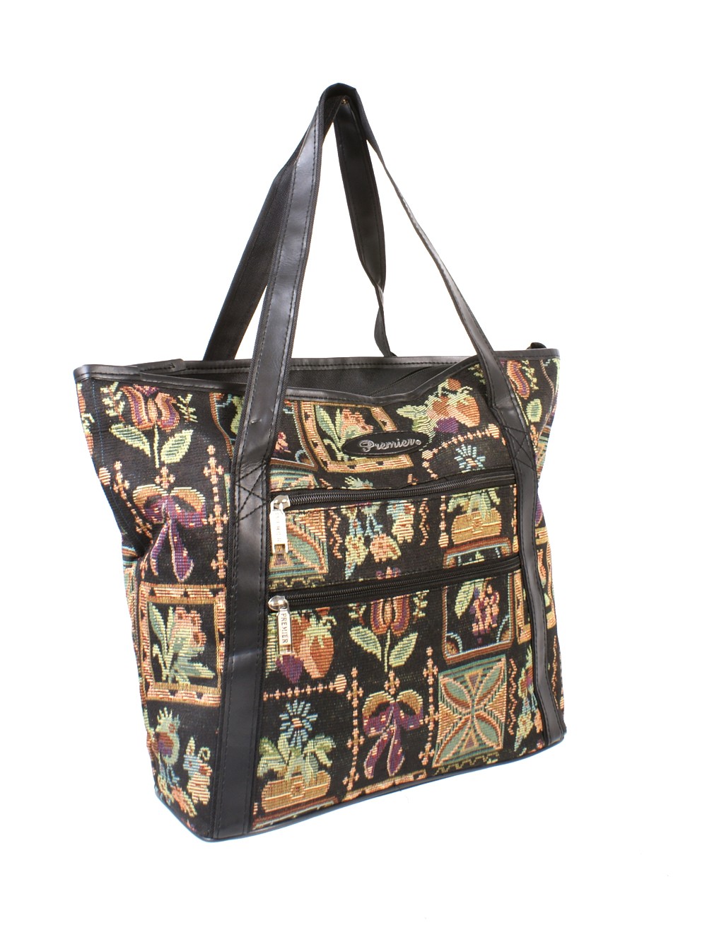 Patterned shopping bag, one main compartment, two front zip pockets. Available in pattern only.