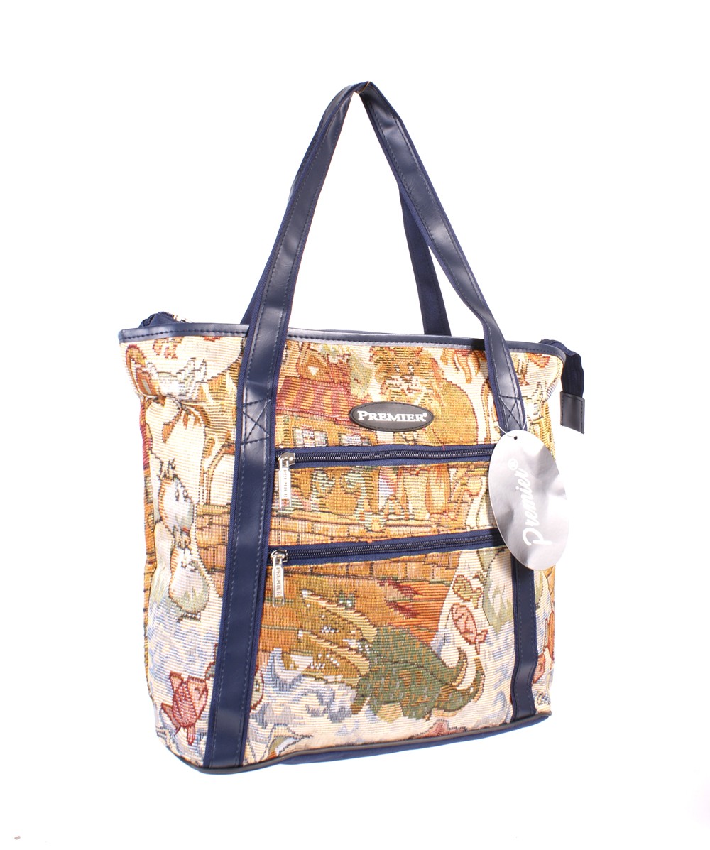 Patterned shopping bag, one main compartment, two front zip pockets. Available in pattern only.