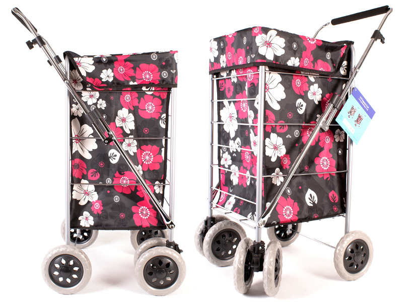 Large square six wheeled shopping trolley with one main compartment with a flap over the top closure. The shopping bag can be removed easily. The front wheels can rotate 360 degrees for easy movement while in use. Features an adjustable padded trolley handle which can be easily secured at a desired height.
