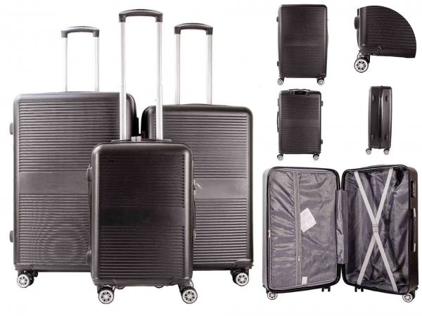 Model: T-HC-06 BLACK SET OF 3 SUITCASE T-HC-06 BLACK SET OF 3 TRAVEL TROLLEY SUITCASE New 4 Wheel 360-degree hard case Suitcase Cabin Trolley -4x 360 DEGREE SPINNER WHEELS -FULLY LINED -LIGHTWEIGHT -PERFECT GLIDE SYSTEM -STRONG AND DURABLE -PUSH-BUTTON TROLLEY SYSTEM -CROSS BELT INTERIOR -SCRATCH-RESISTANT OUTER SHELL -COMBINATION LOCK -Exterior Material Made of 100% ABS = Lightweight Yet Durable! -Strong Metal Zippers – Top carry handle for easy grip and easy lifting -One big compartment with buckle locks for holding the clothes. Dimensions :(including Wheels and Fittings): 77cm (28 inches) SIZE: 77X49X29cm (28″X19.3″X11.4″inches) Volume: 95. 4L Weight: 4KGS 62cm (26 inches) SIZE: Size: 62X46X26cm (26″X18.1″X10.2″ inches) Volume:60L Weight: 3.6KGS 57CM (20 inches) Size: 57X38.5X22cm (20″X15.2″X8. 7″inches) Volume: 38.5L Weight: 2.6KGS Barcode – 5053183 072888